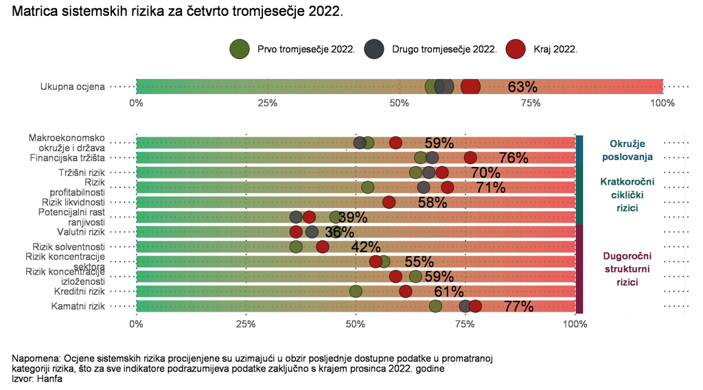 Prema rezultatima provedenih analiza, izloženost dugoročnim rizicima na kraju 2022. ostala je za fondove i financijska društva na povišenoj razini. Najizraženiji dugoročni sistemski rizik i dalje je kamatni rizik. Vrlo visoke stope inflacije i povijesno snažan zaokret globalne monetarne politike u 2022. nije investitorima omogućio zaklon od knjiženja financijskih gubitaka, neovisno o njihovu profilu rizičnosti. Prelazak iz okružja povijesno niskih kamatnih stopa u okružje relativno viših troškova financiranja negativno se odrazio na vrednovanja svih klasa financijske imovine, od onih najsigurnijih (državne obveznice investicijskog rejtinga) pa sve do špekulativnih (primjerice tzv. growth kompanije i kriptovalute). Povećanje kamatnog i tržišnog rizika također se odrazilo i na rast rizika profitabilnosti, a u određenim segmentima tržišta i na rast likvidnosnih pritisaka. Unatoč porastu kratkoročnih sistemskih rizika, kapitalne i likvidnosne zalihe sektora financijskih usluga i dalje su na vrlo visokim razinama, što sektoru financijskih usluga omogućuje dodatnu stabilnost i povećava sposobnost amortizacije potencijalnih budućih sistemskih pritisaka.