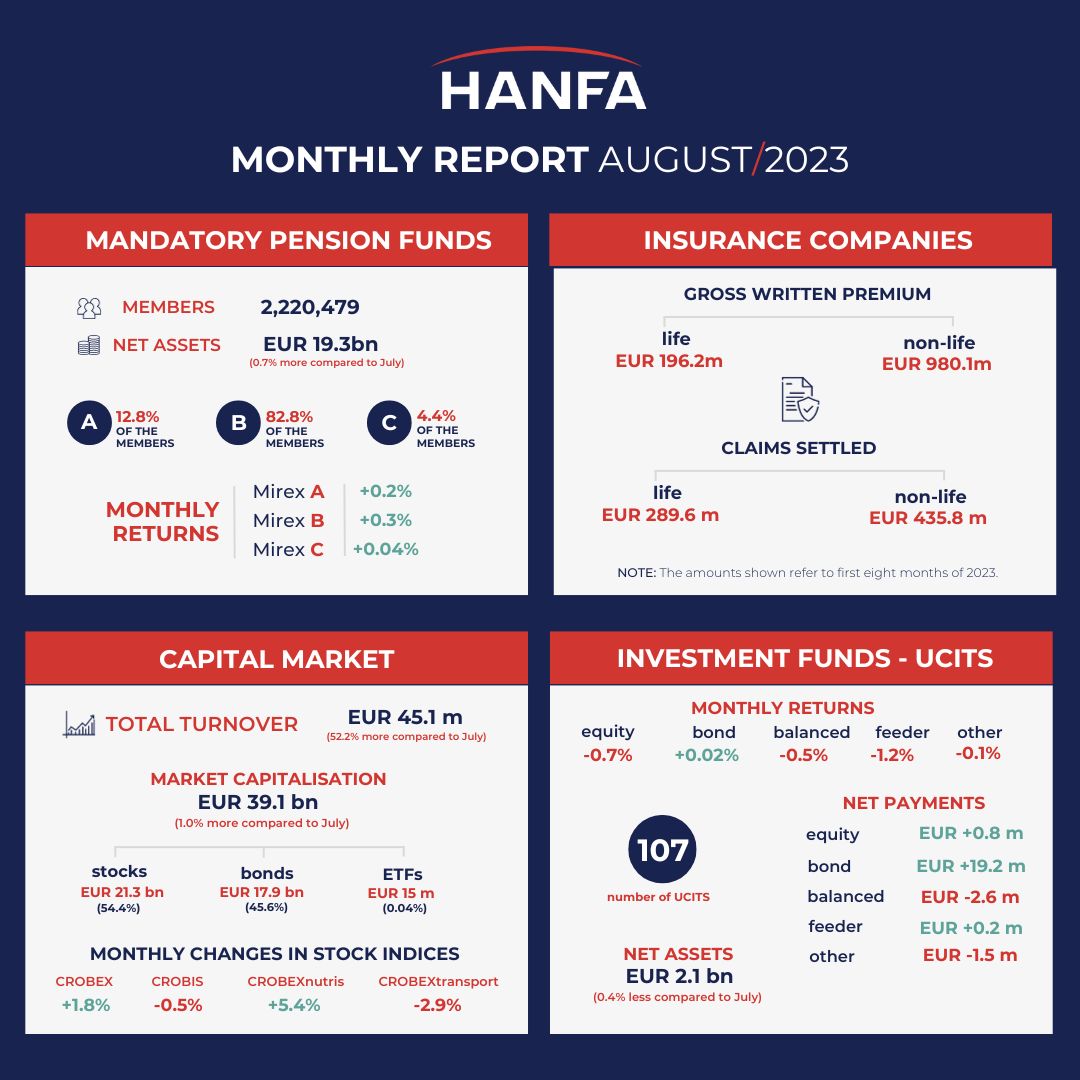 In August 2023, there were 107 UCITS operating on the market, two fewer than in the previous month, as a bond fund and a fund categorised as “other” ceased to operate. Total net assets of UCITS amounted to EUR 2.1bn at the end of the month, decreasing by EUR 7.5m or 0.4% compared to the previous month. Total monthly net payments of all UCITS in August were positive and reached EUR 16.1m. Negative net payments were recorded by balanced funds (EUR -2.6m) and funds categorised as “other funds” (EUR -1.5m). Positive net payments were recorded by bond funds (EUR 19.2m), equity funds (EUR 0.8m) and feeder funds (EUR 0.2m). Bond funds’ net assets accounted for 40.5% of the total net assets of all UCITS at the end of August, while equity and balanced funds accounted for 16.3% and 13.4% of total UCITS’ net assets respectively. In August 2023, negative asset-weighted average monthly returns were generated by almost all types of UCITS, namely equity (-0.7%), feeder (-1.2%), balanced (-0.5%), and other (-0.1%) funds, while only bond funds recorded a positive return (0.02%).