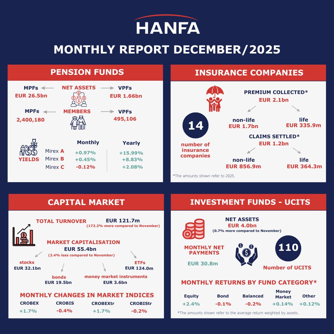 At the end of December 2025, mandatory pension funds (MPFs) had 2,400,180 members, i.e., 3,882 (0.16%) members more than in the previous month. Category B funds had 74.84% of all MPF members, while category A and category C funds had 21.76% and 3.40% of all MPF members respectively. Out of 6,376 new members, 5,960 (93.5%) were automatically allocated by Regos. Termination of membership due to retirement or death was recorded with respect to 2,494 insured persons. Total net contributions paid to MPFs amounted to EUR 159.0m (0.6% of net assets at end-November). At the same time, total payments from all MPFs due to personal account closures reached EUR 55.8m (0.2% of net assets at end-November, rising by EUR 5.7m (11.4%) compared to the previous month.