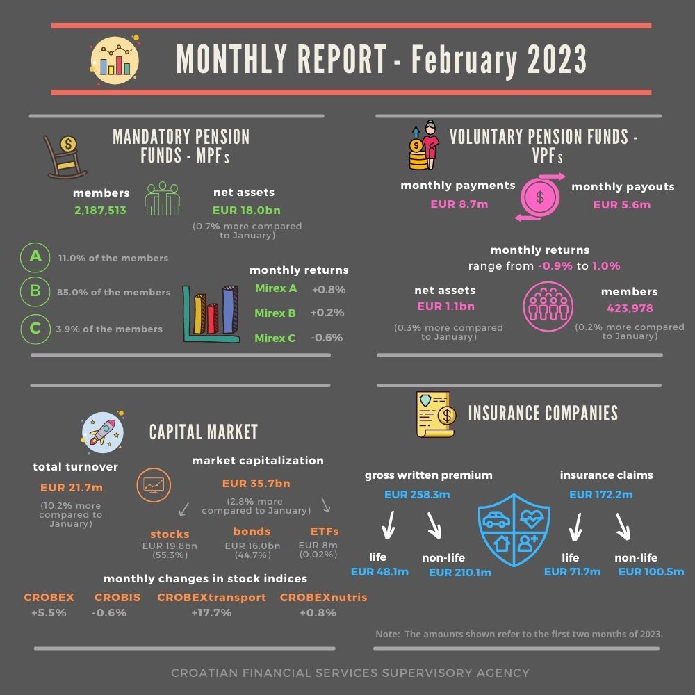 At the end of February 2023, the number of members of 8 open-ended voluntary pension funds (OVPFs) rose by 0.2% on a monthly basis, while the number of members of 21 closed-ended voluntary pension funds (CVPFs) decreased by 0.2%, making the number of members of these funds reach 376,348 and 47,630 respectively. Total monthly payments made to voluntary pension funds (VPFs) in February 2023 amounted to EUR 8.7m (0.8% of their net assets at end-January 2023), decreasing by EUR 1.3m compared to the previous month. Total payments made from these funds in February reached EUR 5.6m, rising by EUR 0.8m (17.8%) compared to total payments made from VPFs in the previous month. Total payments from VPFs made due to retirement and other reasons accounted for 74.2%, payments made due to the change of fund reached 19.2%, while those made due to death accounted for 6.6% of total payments in February. As regards total payments made due to retirement, the amount of EUR 1.7m was paid in the form of lump-sum payments, EUR 1.3m was transferred to pension insurance companies, while EUR 1.1m was paid through a pension company (fund).