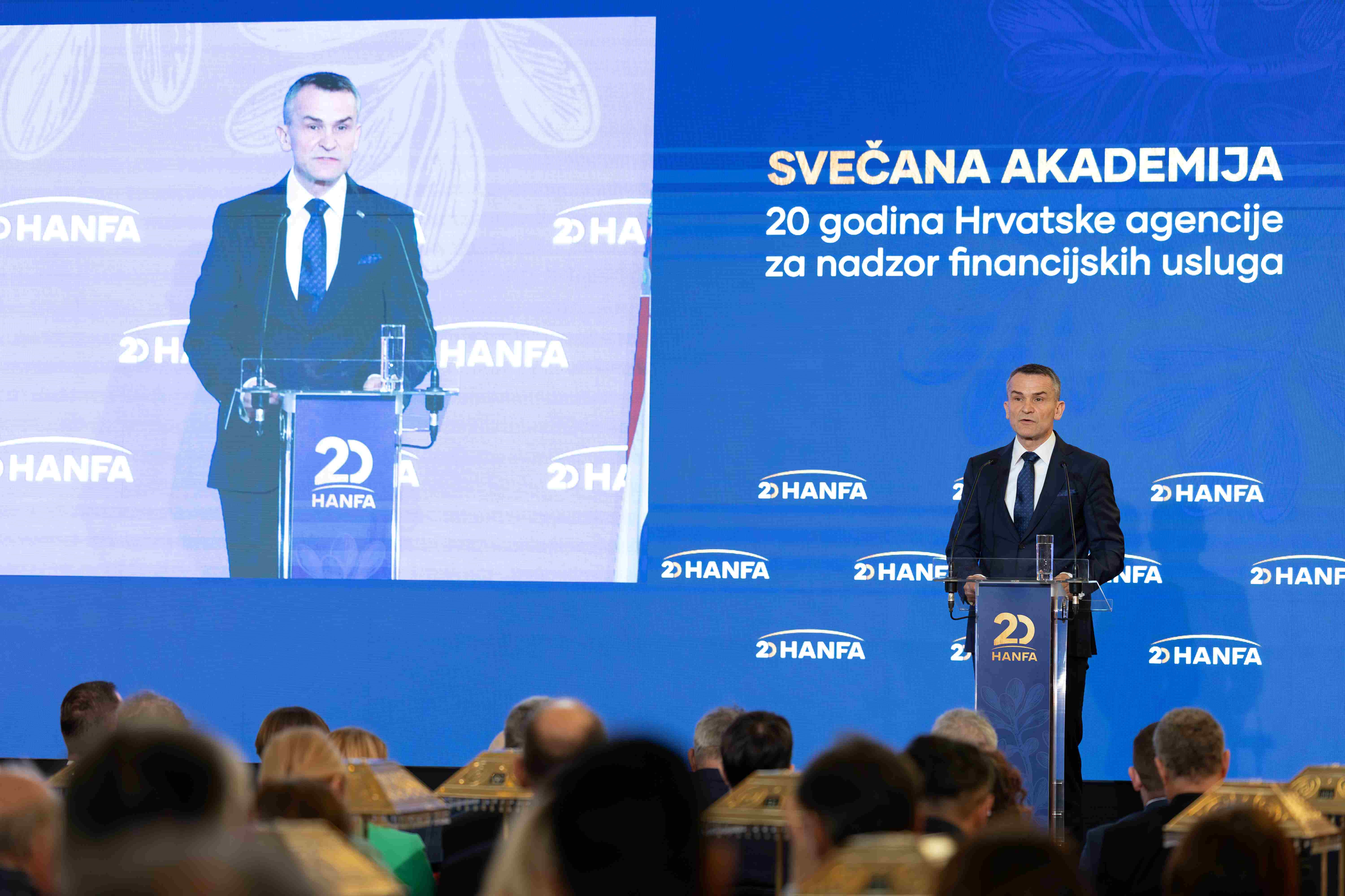 At a ceremonial event held today at the Croatian State Archives in Zagreb, the Croatian Financial Services Supervisory Agency (Hanfa) marked two decades of activity, during which it has grown into a distinctive and modern institution that contributes to the development and stability of the Republic of Croatia's financial system, the improvement of regulation in the financial services market, and the protection of consumers of financial products and services.