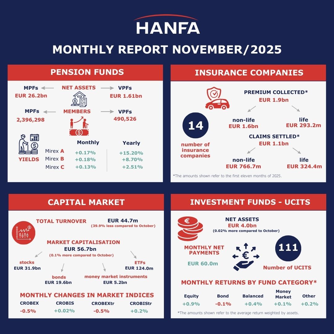 At the end of November 2025, the number of members of 8 open-ended voluntary pension funds (OVPFs) rose by 0.5% on a monthly basis, as did the number of members of 21 closed-ended voluntary pension funds (CVPFs), making the number of members of these funds reach 439,866 and 50,660 respectively. Total monthly payments made to voluntary pension funds (VPFs) in November 2025 amounted to EUR 14.0m (0.9% of net assets at end-October), increasing by 16.3% compared to the previous month. Total payments made from these funds reached EUR 4.5m, decreasing by 21.8% on a monthly basis. Total payments from VPFs made due to retirement and other reasons accounted for 68.3%, payments made due to the change of fund reached 25.8%, while those made due to death accounted for 5.9% of total payments. As regards total payments made due to retirement, the amount of EUR 1.7m was paid through a pension company (fund), EUR 0.9m was paid in the form of lump-sum payments, while the amount of EUR 0.5m was transferred for payment to pension insurance companies. In November, net assets of VPFs increased by EUR 11.3m (0.7% on a monthly basis) and stood at EUR 1.61bn. Monthly nominal returns of VPFs ranged from -0.7% to 0.5%, while returns on an annual basis ranged from 2.0% to 14.4%. As regards the investment structure of VPFs, the largest part of the portfolio was made up of bonds and amounted to a 53.5% share in total net assets, followed by stocks with a 27.9% share and investment funds with a 9.4% share. The share of bonds in VPFs’ investments increased on a monthly basis by 0.4 p.p., the equity share rose by 0.03 p.p., while the share of investments in investment funds declined by 1.3 p.p.