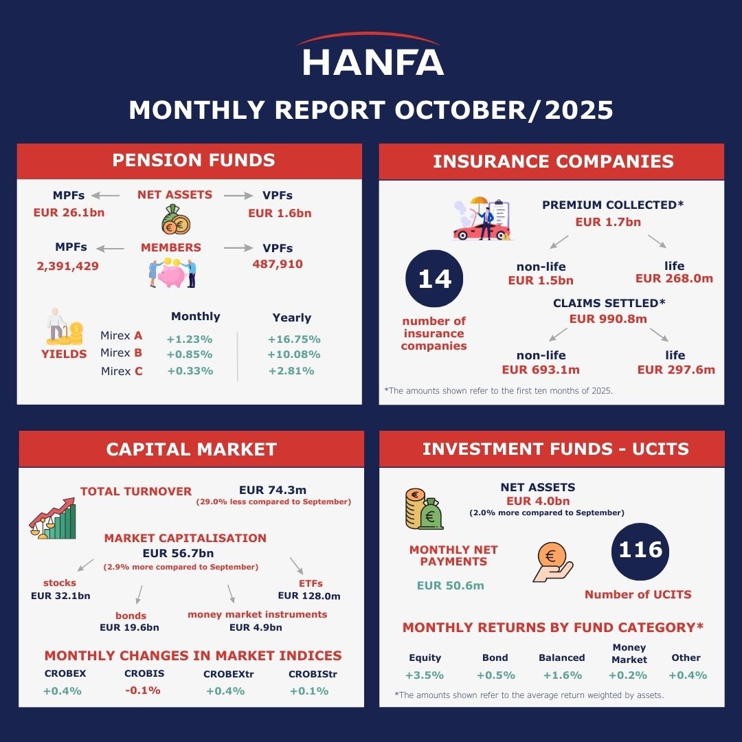 At the end of October 2025, the number of members of 8 open-ended voluntary pension funds (OVPFs) rose by 0.5% on a monthly basis, while the number of members of 21 closed-ended voluntary pension funds (CVPFs) increased by 0.1%, making the number of members of these funds reach 437,491 and 50,419 respectively. Total monthly payments made to voluntary pension funds (VPFs) in October 2025 amounted to EUR 12.0m (0.8% of net assets at end-September), increasing by 3.4% compared to the previous month. Total payments made from these funds reached EUR 5.8m in October, increasing by 12.5% on a monthly basis. Total payments from VPFs made due to retirement and other reasons accounted for 65.6%, payments made due to the change of fund reached 24.4%, while those made due to death accounted for 9.9% of total payments in October. As regards total payments made due to retirement, the amount of EUR 1.7m was paid through a pension company (fund), EUR 1.0m was paid in the form of lump-sum payments, and the same amount was transferred for payment to pension insurance companies. In October, net assets of VPFs increased by EUR 20.30m (1.3% on a monthly basis) and stood at EUR 1.6bn. Monthly nominal returns of VPFs ranged from 0.3% to 1.7%, while returns on an annual basis ranged from 2.5% to 16.2%. As regards the investment structure of VPFs, the largest part of the portfolio was made up of bonds and amounted to a 53.2% share in total net assets, followed by stocks with a 27.8% share and investment funds with a 10.6% share. The share of bonds in VPFs’ investments increased on a monthly basis by 0.1 p.p., while the equity share decreased by 0.3 p.p., and the share of investments in investment funds decreased by 0.1 p.p.
