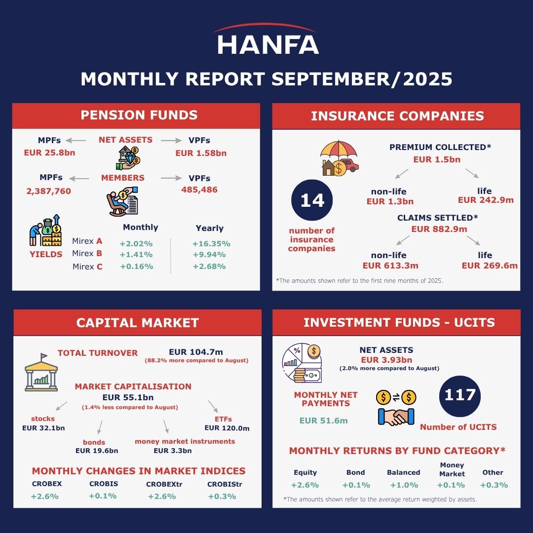 At the end of September 2025, mandatory pension funds (MPFs) had 2,387,760 members, i.e. 7,441 (0.31%) members more than in the previous month. Category B funds had 75.39% of all MPF members, while category A and category C funds had 21.03% and 3.58% of all MPF members respectively. Out of 9,848 new members, 9,323 (94.67%) were automatically allocated by Regos. Termination of membership due to retirement or death was recorded with respect to 2,407 insured persons. Total net contributions paid to MPFs in September amounted to EUR 154.8m (0.6% of net assets at end-August). At the same time, total payments from all MPFs due to personal account closures reached EUR 43.9m (0.2% of net assets at end-August, rising by EUR 12.4m compared to the previous month. At the end of September 2025, MPFs’ net assets amounted to EUR 25.8bn, rising by EUR 441.0m (0.7%) relative to the previous month. Nominal monthly Mirex returns reached 2.02% for category A, 1.41% for category B and 0.16% for category C. Annual Mirex returns reached 16.35% for category A, 9.94% for category B and 2.68% for category C, while annualised[1] returns since the beginning of MPFs’ operation reached 8.41% for Mirex A, 5.54% for Mirex B and 3.29% for Mirex C[2]. At the end of September, MPFs’ bond investments totalled EUR 14.5bn (56.1% of total assets), making their share decrease by 0.59 p.p. on a monthly basis. The share of equity investments in MPFs’ assets increased by 0.71 p.p. on a monthly basis, amounting to 24.5% of MPFs’ assets (EUR 6.3bn) at the end of September. Investments in domestic shares accounted for 14.2%, while investments in foreign shares accounted for 10.3% of MPFs’ assets. Investments in investment funds amounted to EUR 2.6bn (10.3% of the assets), making the proportion of these investments in total assets increase by 0.27 p.p. relative to the previous month. Cash and deposits amounted to 6.5% of the assets, or EUR 1.68bn, decreasing by 0.32 p.p. on a monthly basis.