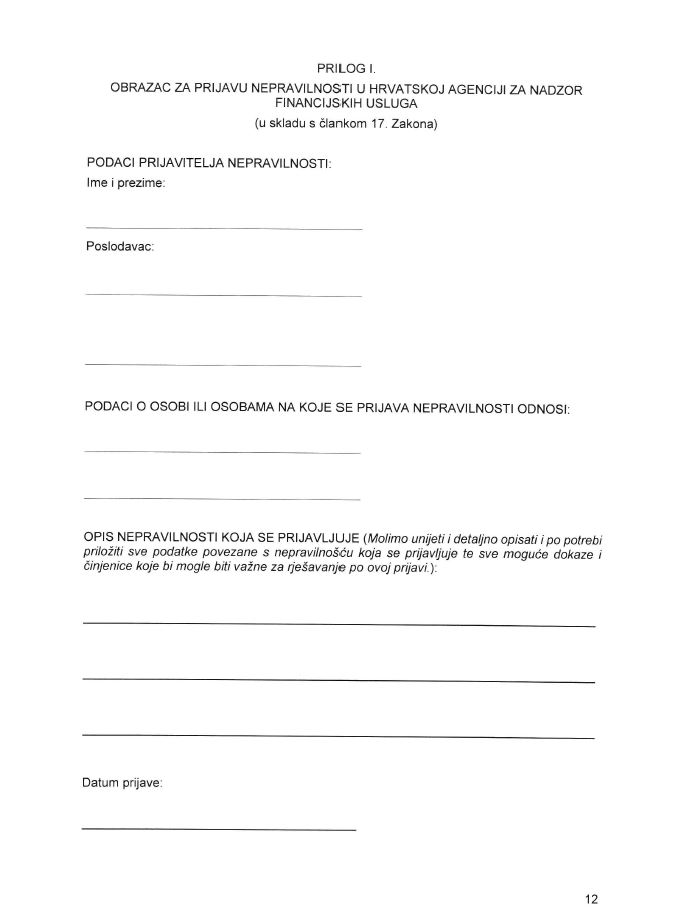 Hrvatska agencija za nadzor financijskih usluga u skladu sa Zakonom o zaštiti prijavitelja nepravilnosti (Narodne novine, broj: 46/2022.) i Pravilnikom o postupku imenovanja povjerljive osobe i unutarnjeg prijavljivanja nepravilnosti u Hrvatskoj agenciji za nadzor financijskih usluga koji objedinjuju najviše pravne standarde za zaštitu prijavitelja nepravilnosti osigurava pouzdani način prijave nepravilnosti kao i sveobuhvatnu zaštitu prijavitelja nepravilnosti.