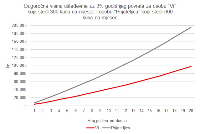 Vi i prijateljica ste se zaposlili u isto vrijeme. Prva plaća za oboje iznosi 3.900 kuna. Prijateljica je štedljivija. Ne puši (odmah ide 300 kuna mjesečno u njenu korist). Malo više pazi koliko troši pri izlascima. Vi stavljate na stranu 300 kuna na mjesec, a ona 600. Recimo da će tako biti kroz dvadeset godina i da se na štednju u prosjeku može ostvariti 3% povrata na godinu. S koliko će novca svatko od vas raspolagati za 20 godina?