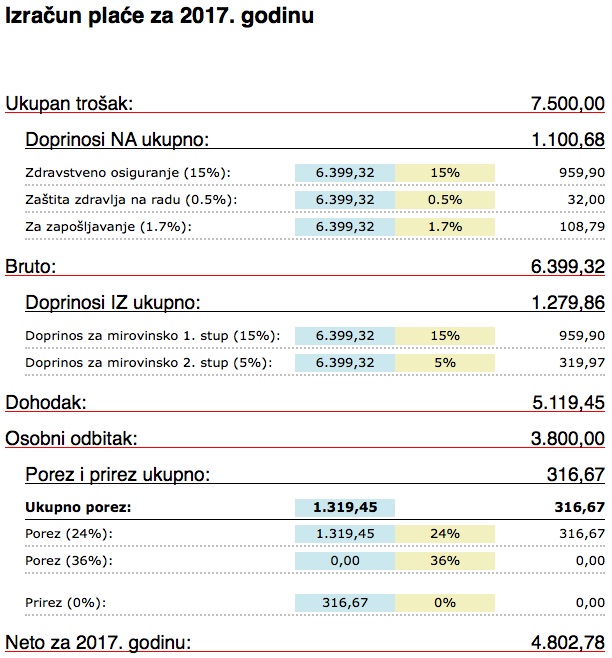 Sljedeća tablica prikazuje stvaran obračun dohotka (plaće) jedne osobe koja svakoga mjeseca prima neto 4.745,78 kuna. To je iznos koji se isplaćuje na račun i s kojim osoba može slobodno raspolagati.