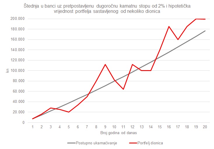 Jedna od najvažnijih stvari koje ćete uzeti u obzir je vremenski horizont. Odgovorni ljudi rano počinju štedjeti primjerice za mirovinu. Uz tako dug vremenski horizont štednje, povremene oscilacije linije štednje u dionicama ispod linije štednje u banci neće odveć zabrinuti.