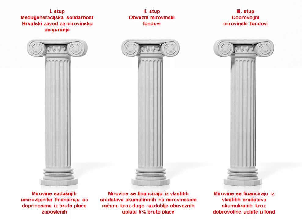 Govori se o drugom i trećem mirovinskom stupu jer prvi stup mirovinskog osiguranja osigurava Hrvatski zavod za mirovinsko osiguranje iz javnog novca. Svi ljudi koji rade, iz svojih zarada uplaćuju mirovinski doprinos koji se koristi za financiranje mirovina iz prvog stupa. Ako su nečiji djed ili baka u mirovini, njihove se mirovine svakoga mjeseca isplaćuju iz doprinosa u prvi mirovinski stup što ih uplaćujete vi ili vaši roditelji ako radite.
