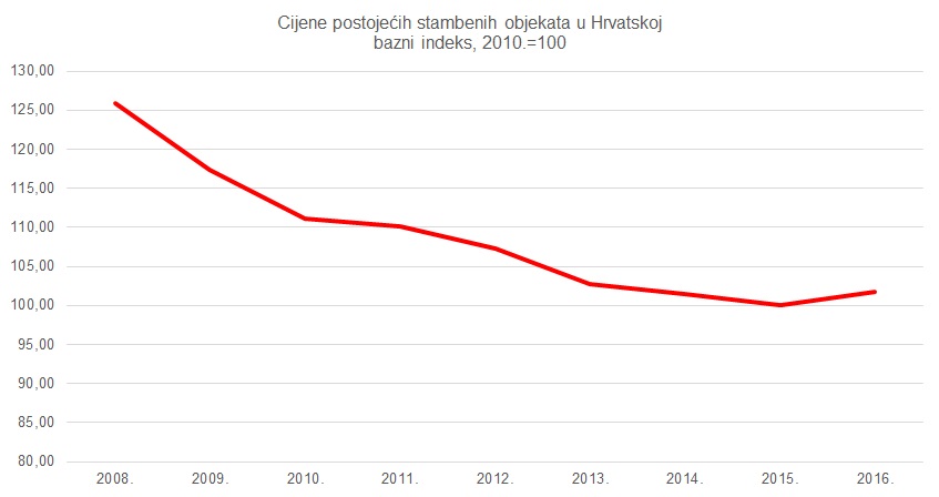 Slika pokazuje kako su se kretale cijene nekretnina u Hrvatskoj u zadnjih 10 godina: cijene nekretnina mogu i pasti. Sada ponovo rastu.