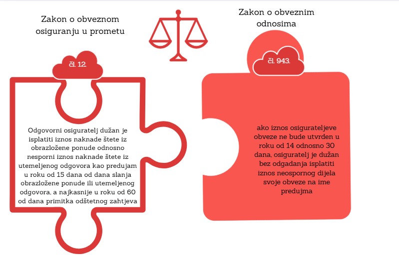 Člankom 12. Zakona o obveznim osiguranjima u prometu (*) propisana je obveza odgovornog osiguratelja da u roku od 60 dana od dana primitka odštetnog zahtjeva utvrdi osnovanost i visinu toga zahtjeva te dostavi oštećenoj osobi pisanu odluku, i to: