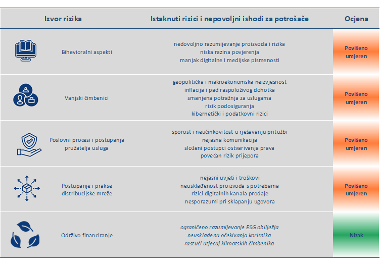 Hrvatska agencija za nadzor financijskih usluga (Hanfa) objavila je početkom 2023. prvi pregled glavnih izvora rizika kojima su tijekom te godine mogli biti izloženi korisnici usluga osiguranja. S namjerom daljnjeg upoznavanja potrošača i šire javnosti s obilježjima usluga osiguranja, ali i ukazivanja društvima za osiguranje i ostalim dionicima na trendove i rizike kojima korisnici usluga osiguranja mogu biti izloženi, Hanfa svake godine objavljuje takav pregled glavnih rizika za korisnike, a od objave za 2025. godinu pregled je proširen i na segmente leasinga te 2. i 3. stupa mirovinskog osiguranja.