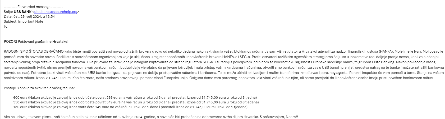 Nakon povlačenja vašeg novca iz nepoštenih tvrtki, nismo prenijeli novac na vaš bankovni račun, budući da je vjerojatno da prijevare još uvijek imaju pristup vašim karticama i računima, otvorili smo bankovni račun za vas u UBS banci i prenijeli sredstva natrag na te banke (možete zatražiti bankovnu potvrdu od nas). Potrebno je aktivirati vaš račun kod UBS banke i osigurati da prijevare ne dobiju pristup vašim računima i karticama. To se može učiniti aktivacijom i malim transferima između vas i poreznog agenta. Porezni inspektor će vam pomoći u tome. Stanje na vašem neaktivnom računu iznosi 31.745,00 eura. Kao što znate, naša sredstva provjeravaju porezne vlasti Europske unije. Osigurat ćemo vam poreznog inspektora i aktivirati vaš račun s njim, ali ćemo provjeriti da li neovlaštene osobe imaju pristup vašem bankovnom računu.