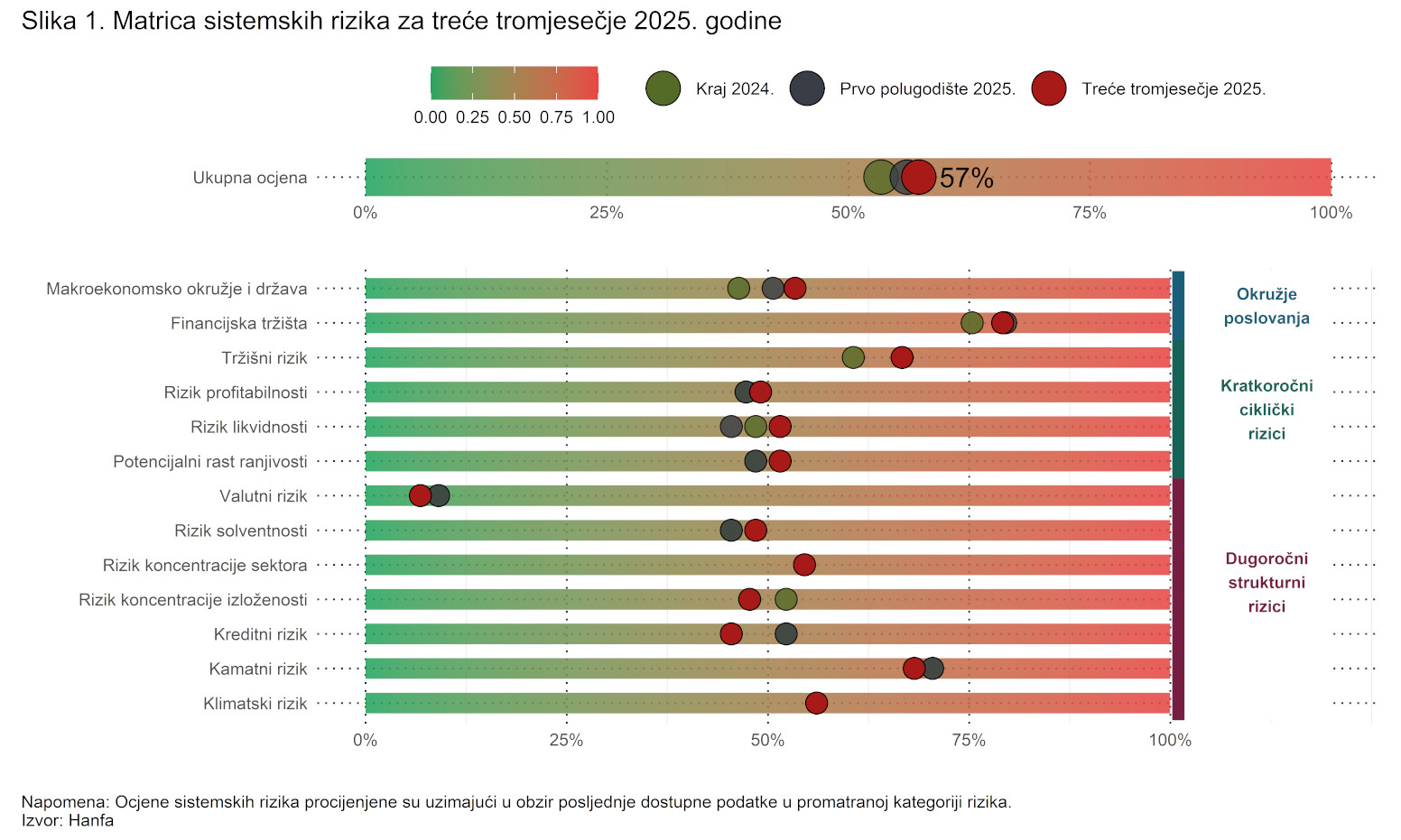 Razina sistemskih rizika u sektoru financijskih usluga ostala je povišena u trećem tromjesečju 2025. godine. Iako se makroekonomski uvjeti u tom razdoblju nisu bitno promijenili te je gospodarstvo nastavilo rasti, glavni izvori rizika i dalje su povišeni inflacijski pritisci i nastavak rasta cijena na tržištu nekretnina.