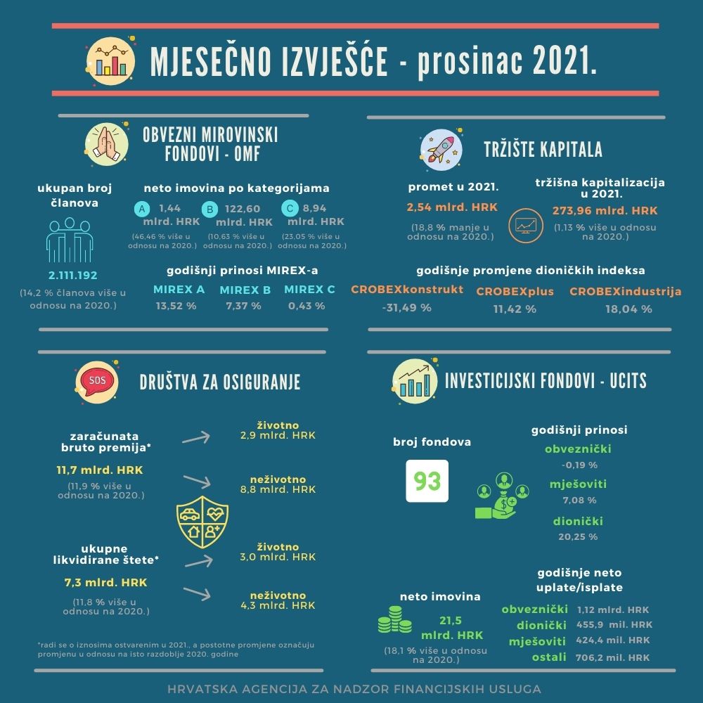U prosincu 2021. poslovala su ukupno 93 UCITS fonda, kao i u prethodnom mjesecu, a ukupna neto imovina UCITS fondova na kraju mjeseca iznosila je 21,5 mlrd. HRK te je bila za 3,3 mlrd. HRK ili 18,1 % viša u odnosu na kraj 2020. godine. Trend pozitivnih ukupnih mjesečnih neto uplata u prosincu je prekinut zbog velikih negativnih neto uplata obvezničkih UCITS fondova, tako da su ukupne neto uplate svih UCITS fondova također zabilježile negativan predznak (-210,8 mil. HRK). Ukupne neto uplate UCITS fondova u 2021. godini imale su pozitivan predznak (3,0 mlrd. HRK), za razliku od 2020. godine, kada je ukupna godišnja vrijednost otkupljenih udjela nadmašila vrijednost izdanih udjela za 4,9 mlrd. HRK. Neto imovina obvezničkih fondova na kraju prosinca činila je 70,0 % ukupne neto imovine svih UCITS fondova, dok su dionički i mješoviti fondovi činili 11,3 % odnosno 6,8 % ukupne neto imovine UCITS fondova.