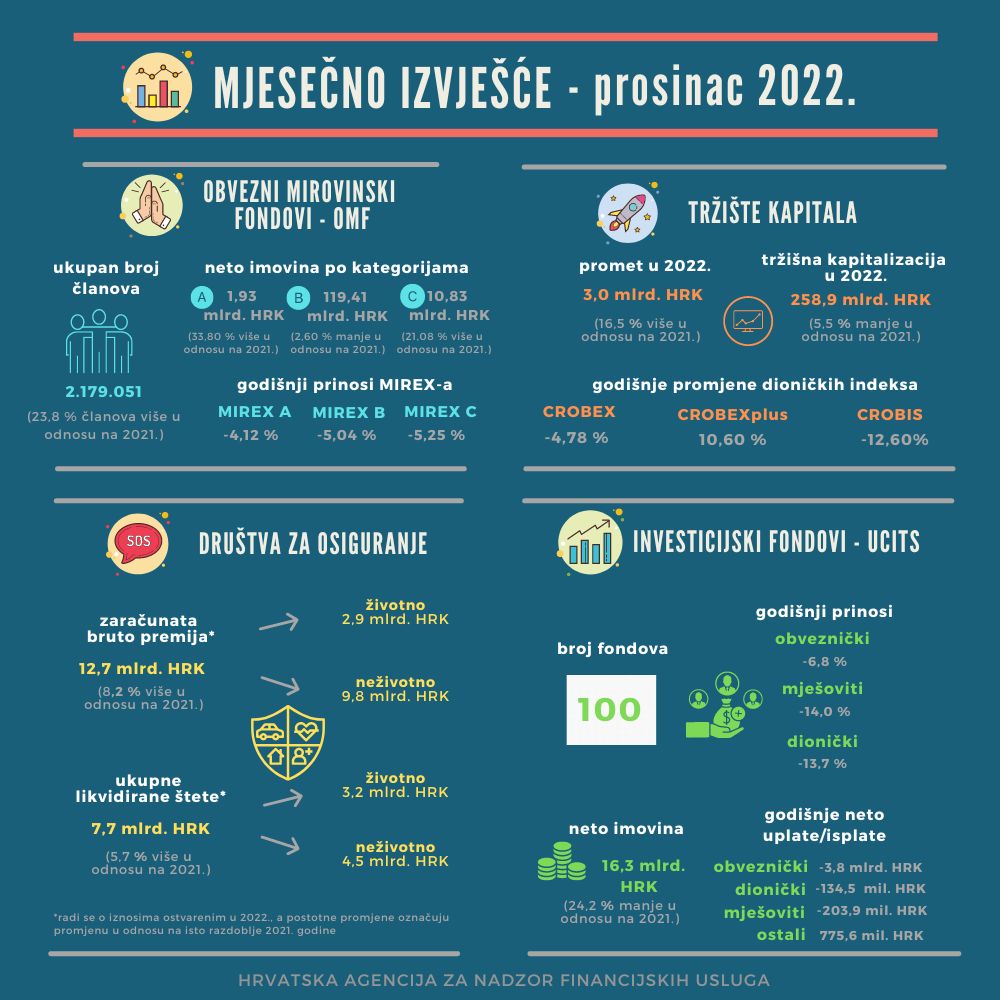 Ukupni promet na Zagrebačkoj burzi u prosincu 2022. iznosio je 214,3 mil. HRK, što predstavlja pad od 4,4 % na mjesečnoj razini. Ukupni promet za cijelu 2022. iznosio je 3,0 mlrd. HRK, što je za 16,5 % više od godišnjeg prometa u prethodnoj godini. Tržišna kapitalizacija neznatno je porasla (za 0,8 %) u odnosu na prethodni mjesec i iznosila je 258,9 mlrd. HRK, od čega su 135,8 mlrd. HRK činile dionice, 123,0 mlrd. HRK obveznice, a 56 mil. HRK ETF-ovi. Na godišnjoj je razini tržišna kapitalizacija u odnosu na kraj prethodne godine manja za 5,5 %. Kod dioničkih indeksa, koji su svi bili pozitivni, najveći mjesečni rast od 13,7 % ostvario je CROBEXkonstrukt, dok je najmanji mjesečni rast zabilježio CROBEXnutris (3,0 %). Glavni dionički indeksi Zagrebačke burze CROBEX i CROBEX10 zabilježili su mjesečni rast od 4,3 %, odnosno 3,1 %. Oba obveznička indeksa zabilježila su umjereni mjesečni rast i to: CROBIS 0,2 % i CROBIStr 0,4 %. Na godišnjoj razini najveći godišnji prinos od 52,5 % ostvario je CROBEXtransport, dok su glavni dionički indeksi zabilježili godišnji pad i to CROBEX -4,8 %, a CROBEX10 -8,4 %, baš kao i oba obveznička indeksa: CROBIS -12,6 % i CROBIStr -10,5 %. Dionica kojom se u prosincu najviše trgovalo bila je dionica društva PLAVA LAGUNA d.d., kojom je ostvaren promet od 12,1 mil. HRK (11,8 % ukupnog trgovanja na burzi u prosincu), a čija je vrijednost ostvarila mjesečni rast od 6,6 %. Dionica koja je ostvarila najveći godišnji promet bila je dionica PODRAVKA d.d., kojom je ostvaren godišnji promet od 178,0 mil. HRK uz godišnji rast cijene od 0,3 %.