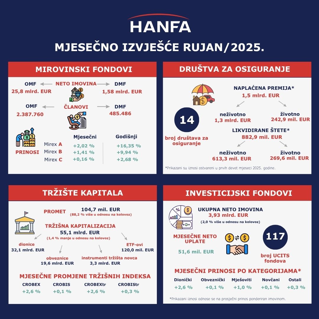 Na kraju rujna 2025. broj članova 8 otvorenih dobrovoljnih mirovinskih fondova (ODMF) povećao se za 0,5 % na mjesečnoj razini, a broj članova 21 zatvorenog dobrovoljnog mirovinskog fonda (ZDMF) za 0,04 % te su spomenuti fondovi imali 435.130 (ODMF) odnosno 50.356 članova (ZDMF). Ukupne uplate u dobrovoljne mirovinske fondove (DMF) u rujnu 2025. iznosile su 11,6 mil. EUR (0,8 % neto imovine s kraja prethodnog mjeseca), što je za 19,3 % više u odnosu na prethodni mjesec. Ukupne isplate iz DMF-ova iznosile su 5,1 mil. EUR, što je na mjesečnoj razini više za 29,9 %. Isplate zbog umirovljenja i ostalih razloga činile su 66,6 %, isplate zbog promjene fonda 25,8 %, a isplate zbog smrti 7,6 % ukupnih isplata u rujnu. Kod ukupnih isplata zbog umirovljenja 1,7 mil. EUR isplaćeno je putem društva (fonda), 1,0 mil. EUR u obliku jednokratnih isplata, a 0,7 mil. EUR transferirano je u mirovinska osiguravajuća društva (MOD-ove). Neto imovina DMF-ova u rujnu povećala se za 22,9 mil. EUR (1,5 % na mjesečnoj razini) te je iznosila 1,58 mlrd. EUR. Mjesečni nominalni prinosi DMF-ova u rujnu su se kretali između 0,03 % i 0,4 %, a prinosi na godišnjoj razini od 2,1 % do 15,0 %. Kod strukture ulaganja DMF-ova najveći dio portfelja čine obveznice (53,1 % imovine), a zatim dionice (28,1 %) i investicijski fondovi (10,7 %). Udio obveznica u ulaganjima DMF-ova povećao se na mjesečnoj razini za 0,1 p.b., udio ulaganja u investicijske fondove veći je za 0,3 p.b., dok je udio dionica porastao za 0,7 p.b.