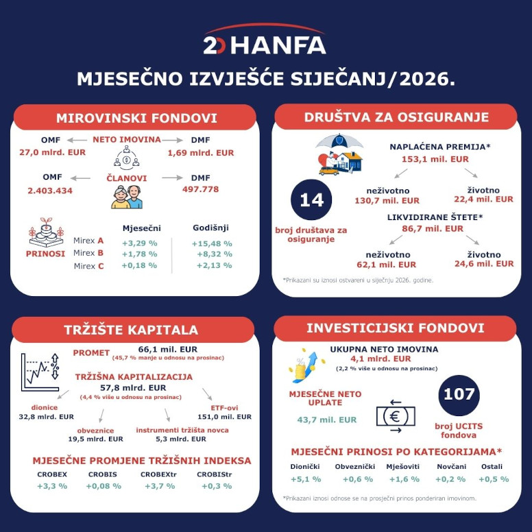 Na kraju siječnja 2026. broj članova 8 otvorenih dobrovoljnih mirovinskih fondova (ODMF) povećao se za 0,58 % na mjesečnoj razini, a broj članova 21 zatvorenog dobrovoljnog mirovinskog fonda (ZDMF) za 0,16 % te su spomenuti fondovi imali 446.698 (ODMF) odnosno 51.080 članova (ZDMF). Ukupne uplate u dobrovoljne mirovinske fondove (DMF) u siječnju 2026. iznosile su 15,2 mil. EUR (0,9 % neto imovine s kraja prethodnog mjeseca), što je za 69,0 % manje u odnosu na prethodni mjesec. Ukupne isplate iz DMF-ova iznosile su 7,8 mil. EUR, što je na mjesečnoj razini više za 37,5 %. Isplate zbog umirovljenja i ostalih razloga činile su 60,1 %, isplate zbog promjene fonda 36,0 %, a isplate zbog smrti 3,9 % ukupnih isplata u siječnju. Kod ukupnih isplata zbog umirovljenja 1,8 mil. EUR isplaćeno je putem društva (fonda), 1,5 mil. EUR u obliku jednokratnih isplata, a 1,3 mil. EUR transferirano je u mirovinska osiguravajuća društva (MOD-ove).