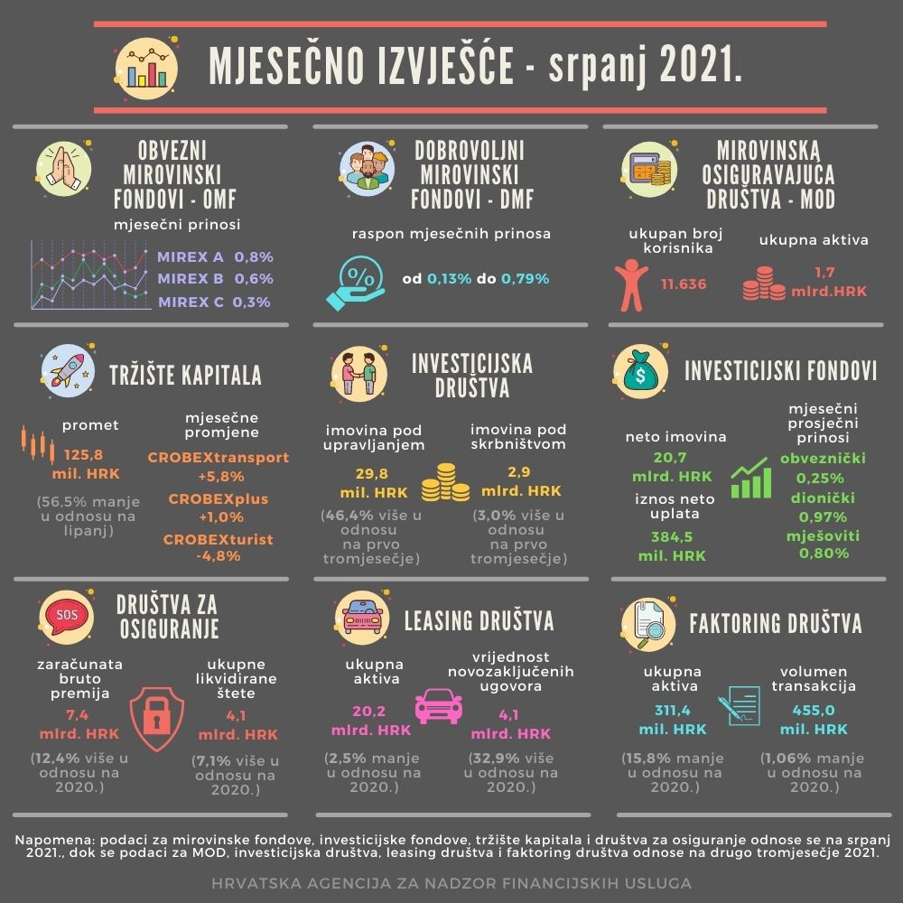 Neto imovina OMF-ova na kraju srpnja 2021. povećala se za 0,9 % na mjesečnoj razini te je iznosila 127,6 mlrd. HRK. Mjesečni prinosi Mirexa iznosili su 0,8 % za kategoriju A, 0,6 % za kategoriju B i 0,3 % za kategoriju C, čime je nastavljen trend oporavka vrijednosti udjela u 2021. Prinosi Mirexa od početka godine iznose 0,3 % za kategoriju C, 4,7 % za kategoriju B i 8,5 % za kategoriju A, dok anualizirani prinosi od početka rada OMF-ova iznose 7,6 % za Mirex A, 5,5 % za Mirex B i 4,8 % za Mirex C.