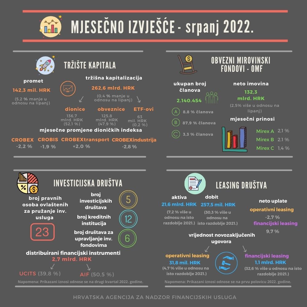 Pregled aktivnosti subjekata u sektoru financijskih usluga za srpanj 2022.