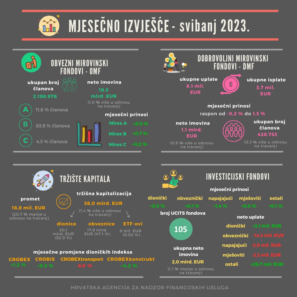 Na kraju svibnja 2023. broj članova 8 otvorenih dobrovoljnih mirovinskih fondova (ODMF) povećao se za 0,4 % na mjesečnoj razini, a broj članova 21 zatvorenog dobrovoljnog mirovinskog fonda (ZDMF) povećao se za 0,03 %, čime su spomenuti fondovi brojali 381.059 (ODMF) odnosno 47.694 (ZDMF) člana. Ukupne uplate u dobrovoljne mirovinske fondove (DMF) u svibnju 2023. iznosile su 8,1 mil. EUR (0,7 % neto imovine s kraja prethodnog mjeseca), što je neznatno povećanje od 0,07 mil. EUR u odnosu na prethodni mjesec. Ukupne isplate iz DMF-ova u svibnju 2023. iznosile su 3,7 mil. EUR, što je za 0,2 mil. EUR (5,7 %) više od isplata u prethodnom mjesecu. Ukupne isplate zbog umirovljenja i ostalih razloga činile su 71,6 %, isplate zbog promjene fonda 21,1 %, a isplate zbog smrti 7,3 % ukupnih isplata u svibnju. Kod ukupnih isplata zbog umirovljenja 1,1 mil. EUR isplaćen je putem mirovinskog društva (fonda), 0,9 mil. EUR u formi jednokratnih isplata, a 0,6 mil. EUR transferirano je u mirovinska osiguravajuća društva (MOD-ove).