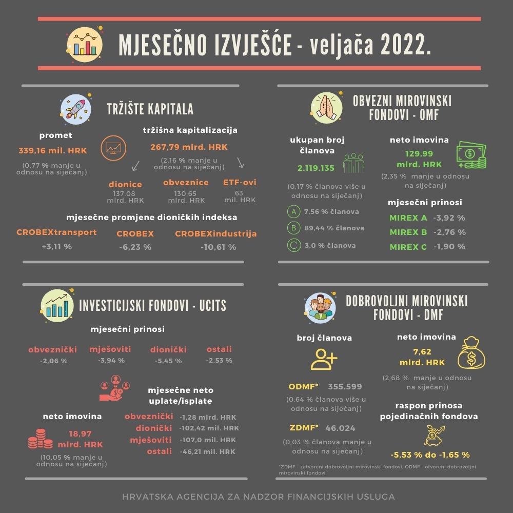 Ukupni promet na Zagrebačkoj burzi u veljači 2022. iznosio je 339,16 mil. HRK, što predstavlja blago smanjenje (od 0,77 %) na mjesečnoj razini. Tržišna kapitalizacija smanjila se za 2,16 % u odnosu na prethodni mjesec i iznosila je 267,79 mlrd. HRK, od čega su 137,08 mlrd. HRK činile dionice, 130,65 mlrd. HRK obveznice, a 62,54 mil. HRK ETF-ovi. Nepovoljna globalna tržišna kretanja odrazila su se i na domaće tržište, gdje su temeljni dionički i obveznički indeksi Zagrebačke burze zabilježili mjesečni pad vrijednosti, i to dionički CROBEX od -6,23 %, a obveznički CROBIS od -3,16 %. Porast geopolitičkih tenzija i makroekonomskih neizvjesnosti heterogeno se odrazio na vrijednost domaćih dioničkih izdanja reflektirajući time različit utjecaj koji te nestabilnosti imaju na pojedine djelatnosti gospodarstva. Tako je primjerice dionički indeks CROBEXtransport zabilježio mjesečni rast od 3,11 %, dok je indeks CROBEXindustrija zabilježio pad od -10,61 % u veljači 2022. godine. Dionica kojom se u veljači najviše trgovalo ponovno je bila dionica HT d.d., kojom je ostvaren promet od 24,0 mil. HRK (12,60 % ukupnog trgovanja dionicama na burzi), a čija je cijena ostvarila mjesečni pad vrijednosti od -0,27 %.
