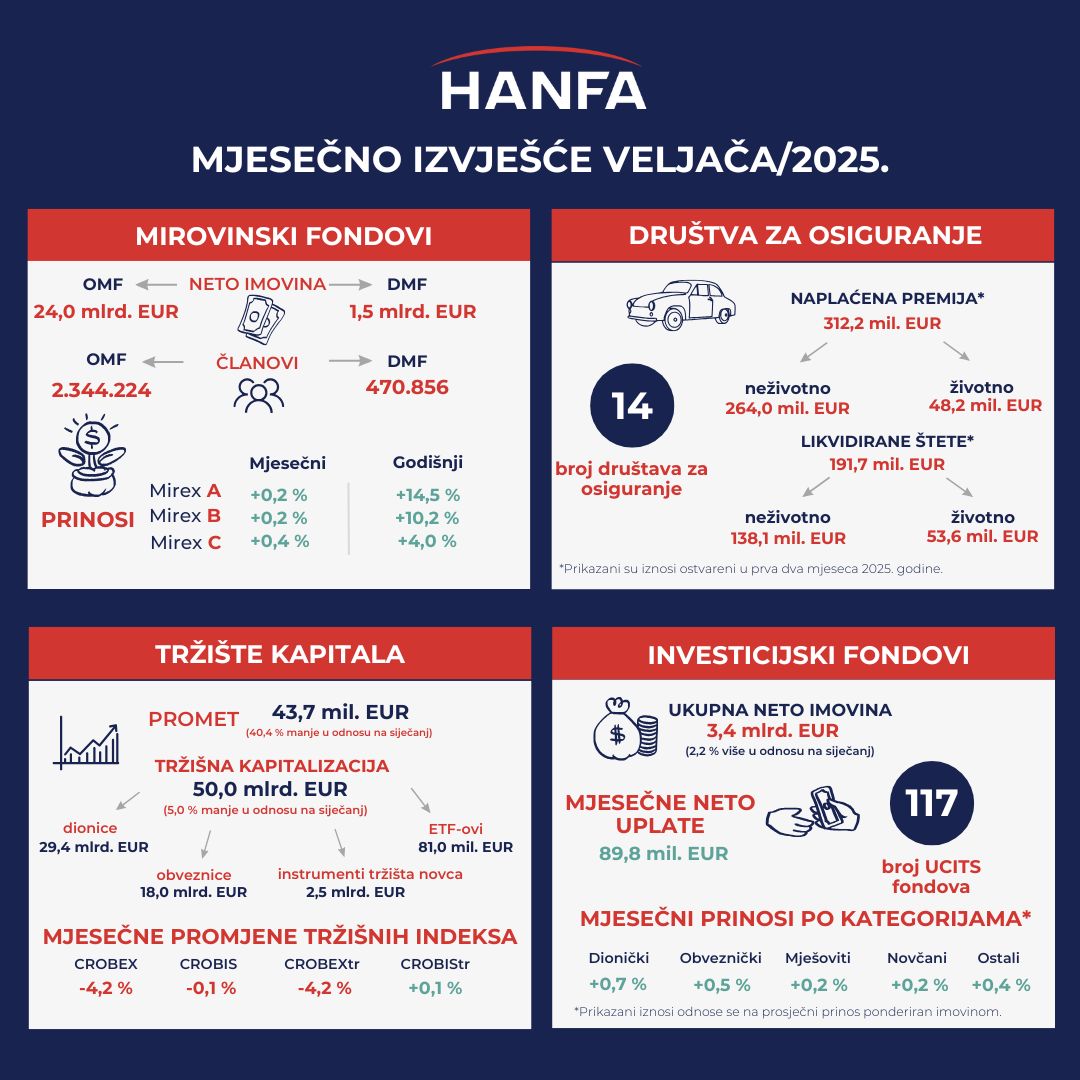 Na kraju veljače 2025. broj članova 8 otvorenih dobrovoljnih mirovinskih fondova (ODMF) povećao se za 0,5 % na mjesečnoj razini, a broj članova 21 zatvorenog dobrovoljnog mirovinskog fonda (ZDMF) za 0,2 % te su spomenuti fondovi imali 421.130 (ODMF), odnosno 49.726 članova (ZDMF). Ukupne uplate u dobrovoljne mirovinske fondove (DMF) u veljači 2025. iznosile su 11,5 mil. EUR (0,8 % neto imovine s kraja prethodnog mjeseca), što je smanjenje od 10,5 % u odnosu na prethodni mjesec. Ukupne isplate iz DMF-ova u veljači 2025. iznosile su 6,4 mil. EUR, što je na mjesečnoj razini smanjenje od 11,9 %. Ukupne isplate zbog umirovljenja i ostalih razloga činile su 70,8 %, isplate zbog promjene fonda 25,7 %, a isplate zbog smrti 3,5 % ukupnih isplata u veljači. Kod ukupnih isplata zbog umirovljenja 1,7 mil. EUR isplaćeno je putem društva (fonda), 1,1 mil. EUR transferirano je u mirovinska osiguravajuća društva (MOD-ove), a 1,7 mil. EUR u obliku jednokratnih isplata. Neto imovina DMF-ova u veljači se povećala za 5,1 mil. EUR (0,3 % na mjesečnoj razini) te je iznosila 1,49 mlrd. EUR. Mjesečni nominalni prinosi DMF-ova u veljači su se kretali između -0,5 % i +1,3 %, a prinosi na godišnjoj razini od 3,5 % do 13,5 %. Kod strukture ulaganja DMF-ova najveći dio portfelja čine obveznice (55,1 % imovine), zatim dionice (25,8 %), te investicijski fondovi (10,6 %). Udio obveznica u ulaganjima DMF-ova povećao se na mjesečnoj razini za 1,2 p.b., udio dionica smanjio se za 0,3 p.b., dok se udio ulaganja u investicijske fondove povećao za 0,1 p.b.
