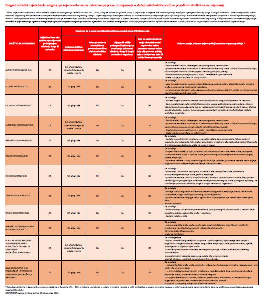 U tablici se mogu pronaći pojednostavljene i skraćene odredbe, pri čemu nisu obuhvaćene cjelokupne odredbe o isključenim rizicima / gubicima prava iz kasko-osiguranja, ni cjelokupne odredbe o obvezama osiguranika nakon nastanka osiguranog slučaja.
