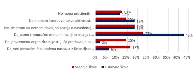 Većina njih smatra da bi financijska pismenost trebala biti integrirana u kurikulum kao sastavni dio obrazovanja, a ne obrađivana povremeno ili u sklopu projekata. Istodobno, velik broj ispitanika iskazuje visoku motiviranost za rad s učenicima na toj temi, ali i otvoreno ističe da im nedostaje dodatnog stručnog znanja, kvalitetnih i prilagođenih nastavnih materijala te sustavne podrške. Drugim riječima, interes i volja postoje, no potrebni su alati i edukacija.